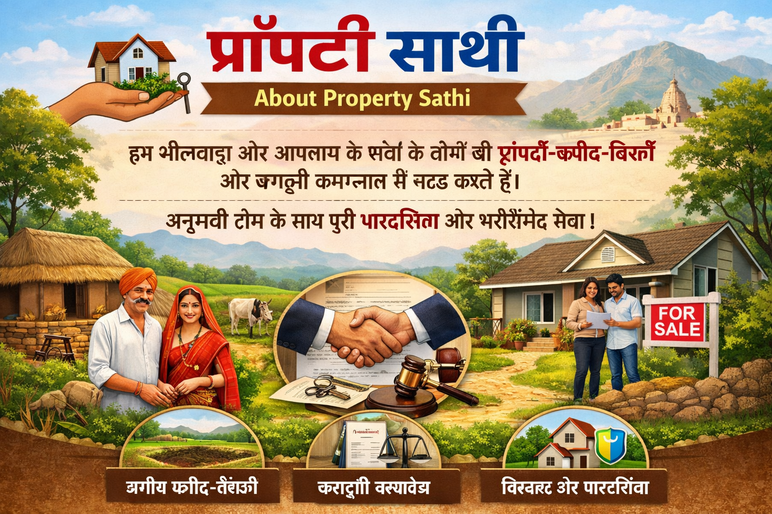 हम भीलवाड़ा और आसपास के गांवों के लोगों की प्रॉपर्टी खरीद-बिक्री और कानूनी कागज़ात में मदद करते हैं। हमारी अनुभवी टीम पूर्ण पारदर्शिता और भरोसे के साथ हर ग्राहक को सबसे अच्छी सेवा देती है।